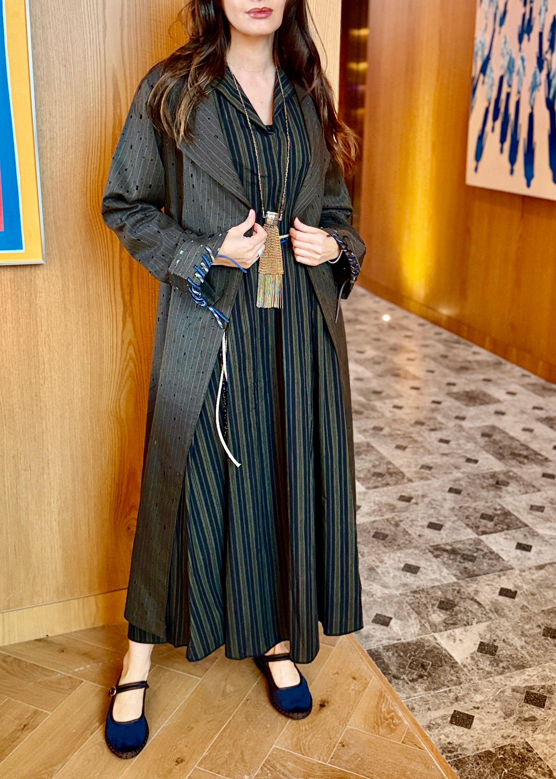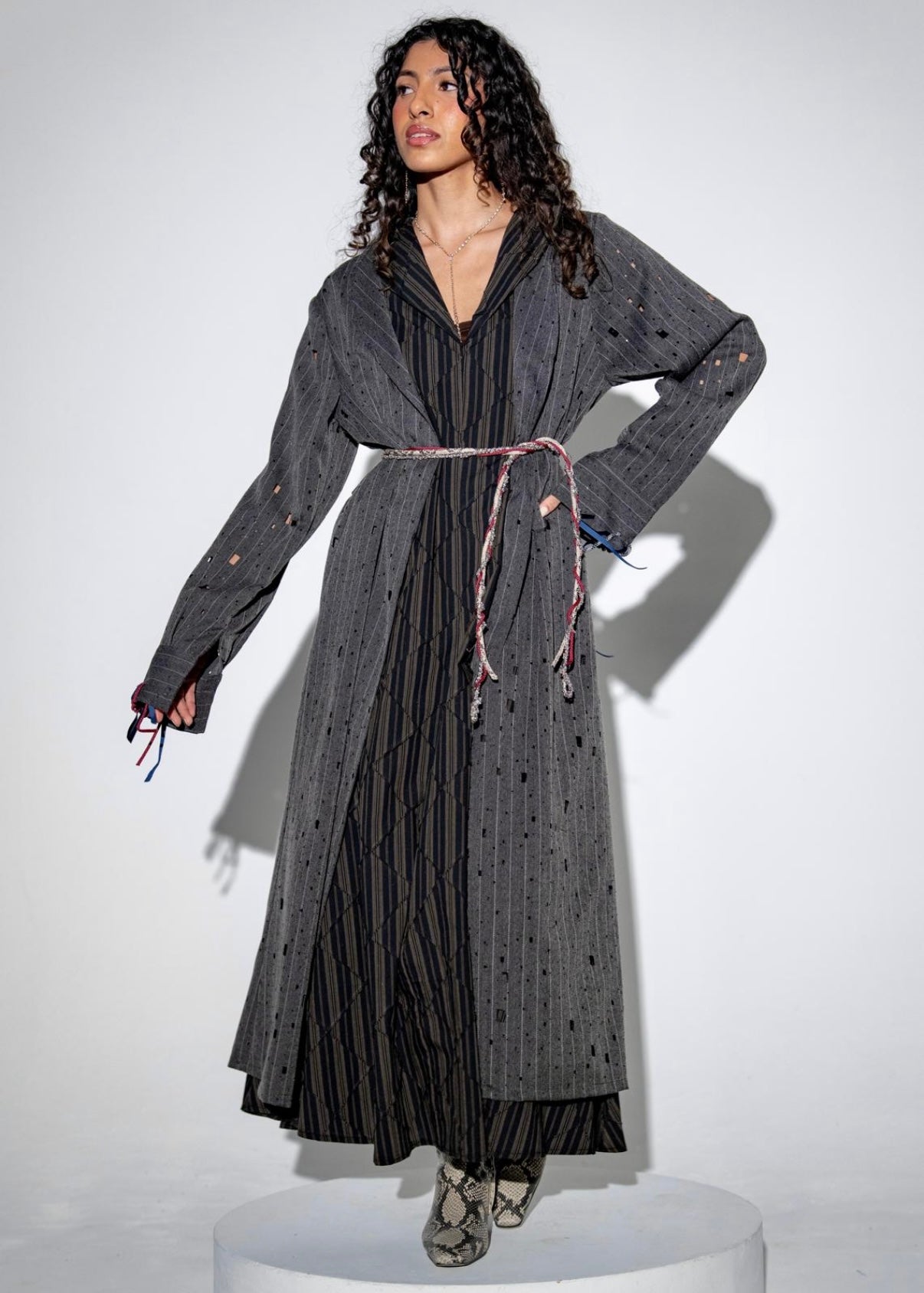 A two-piece set grey or brown bisht with black stripes long sleeves inner dress, finished with a trio belt.