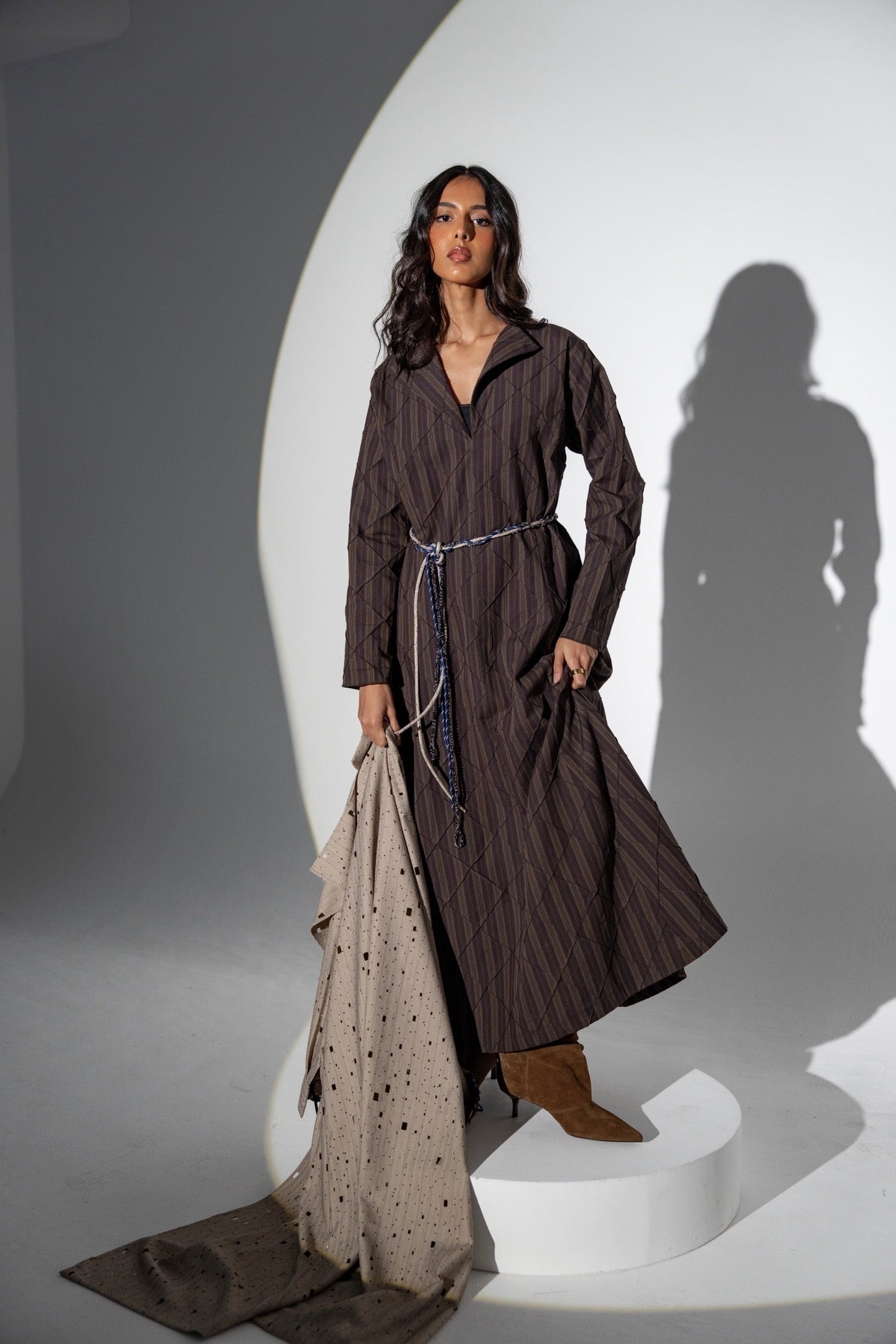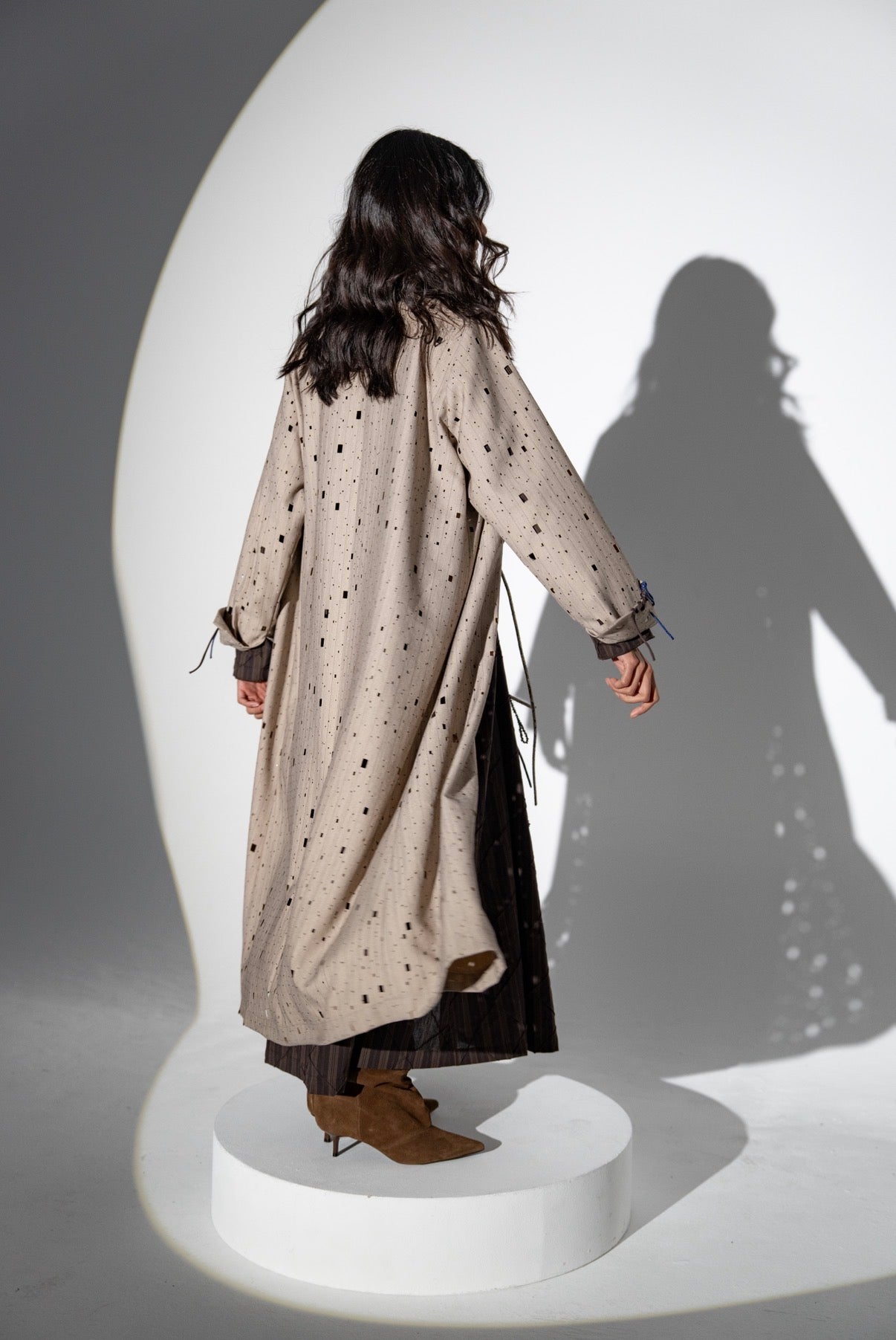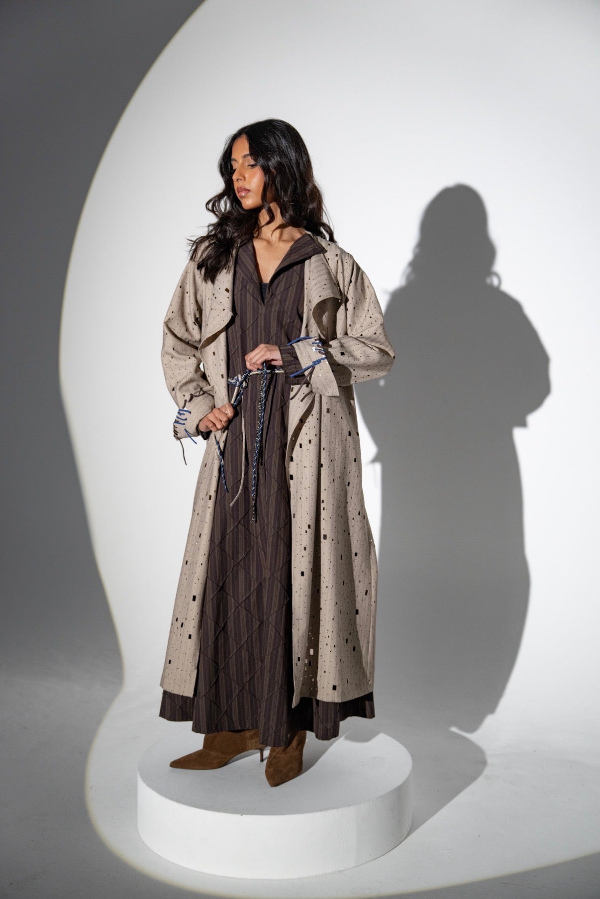 A two-piece set with a beige bisht and a brown long-sleeve dress, finished with a trio belt.