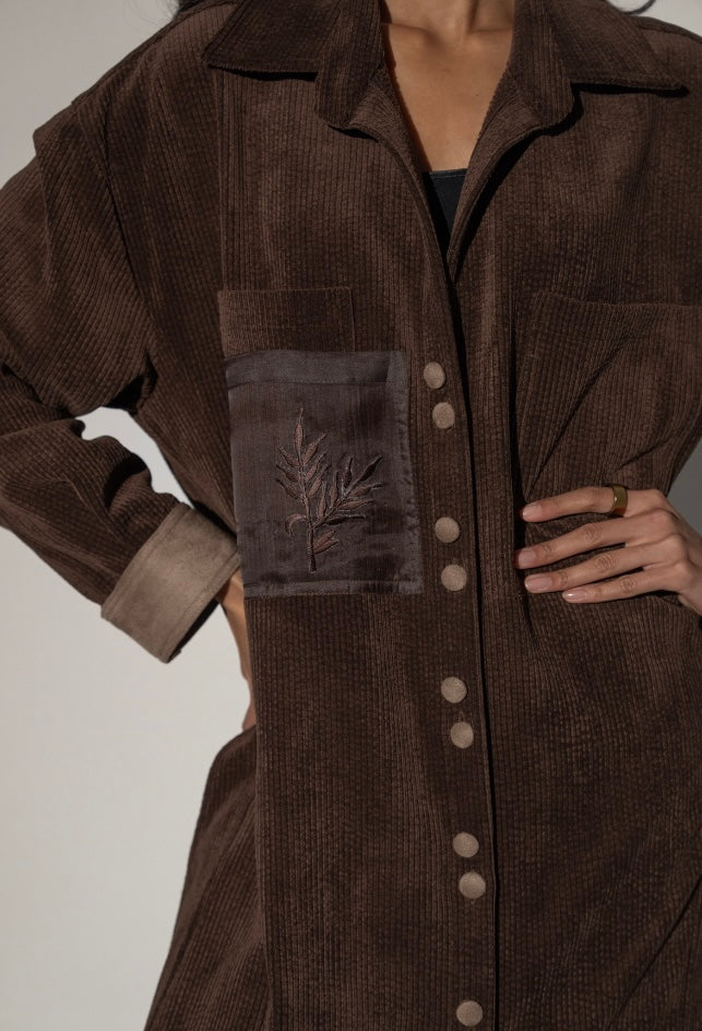 A corduroy shirt dress with pocket details and embroidery.