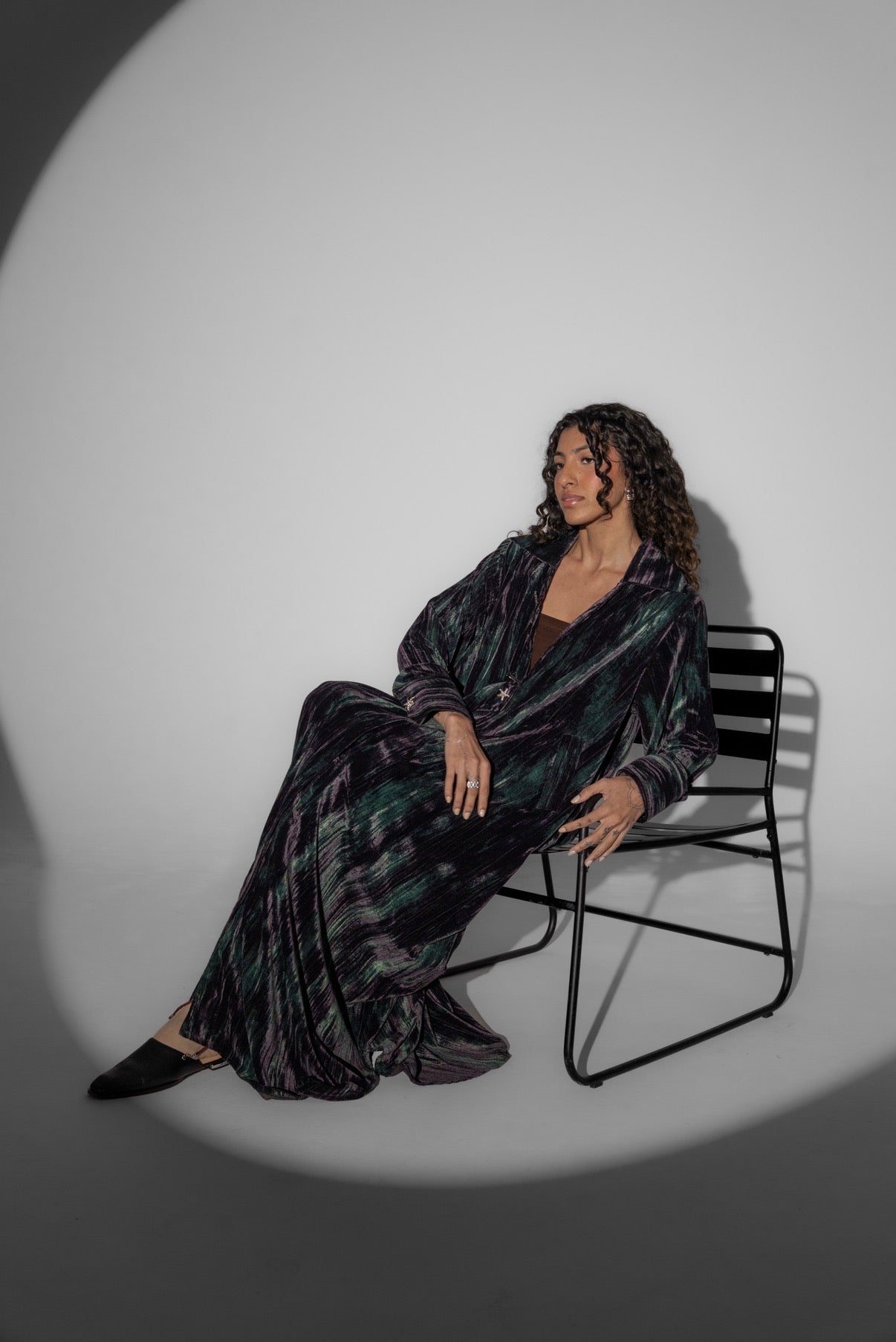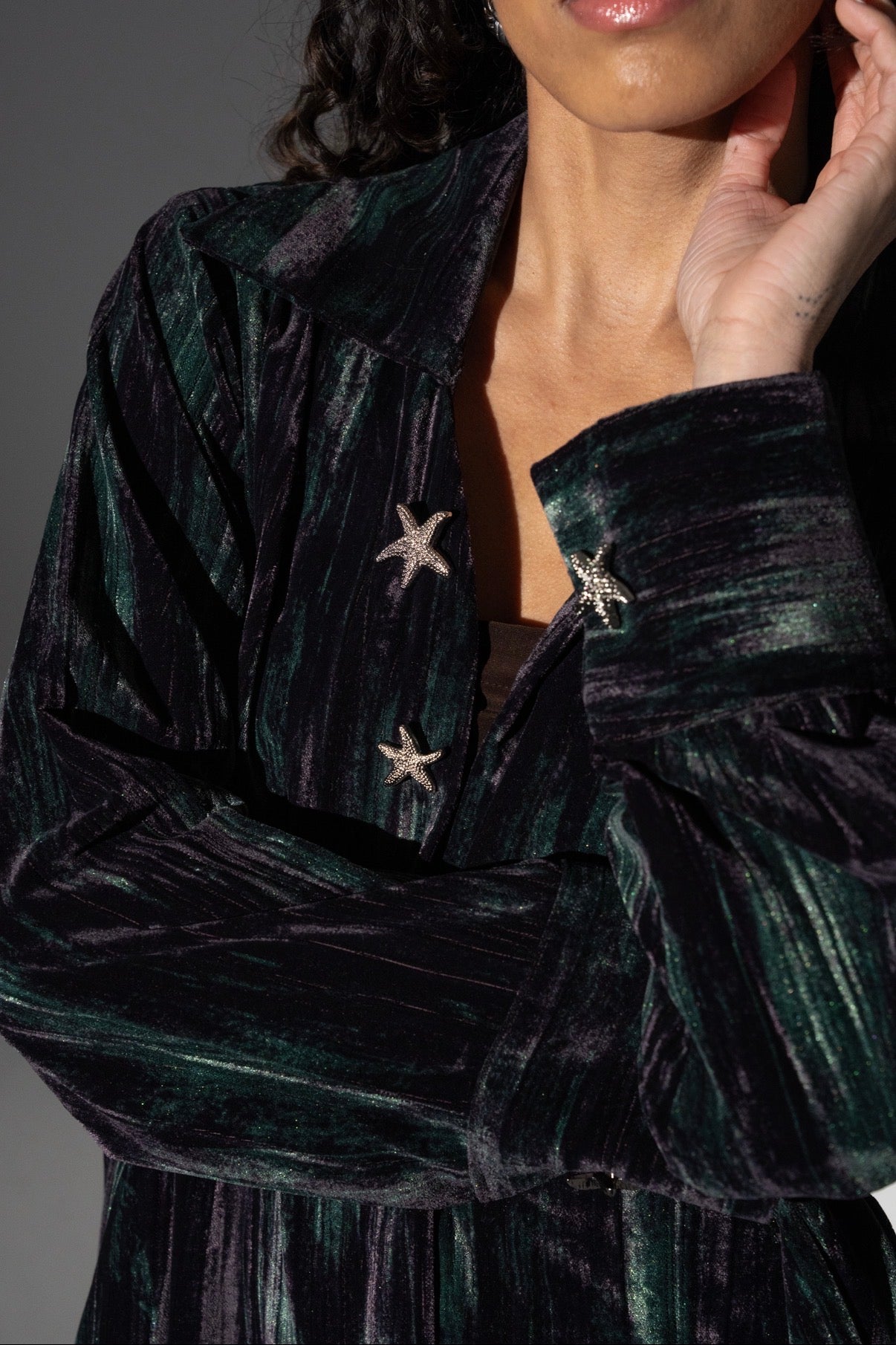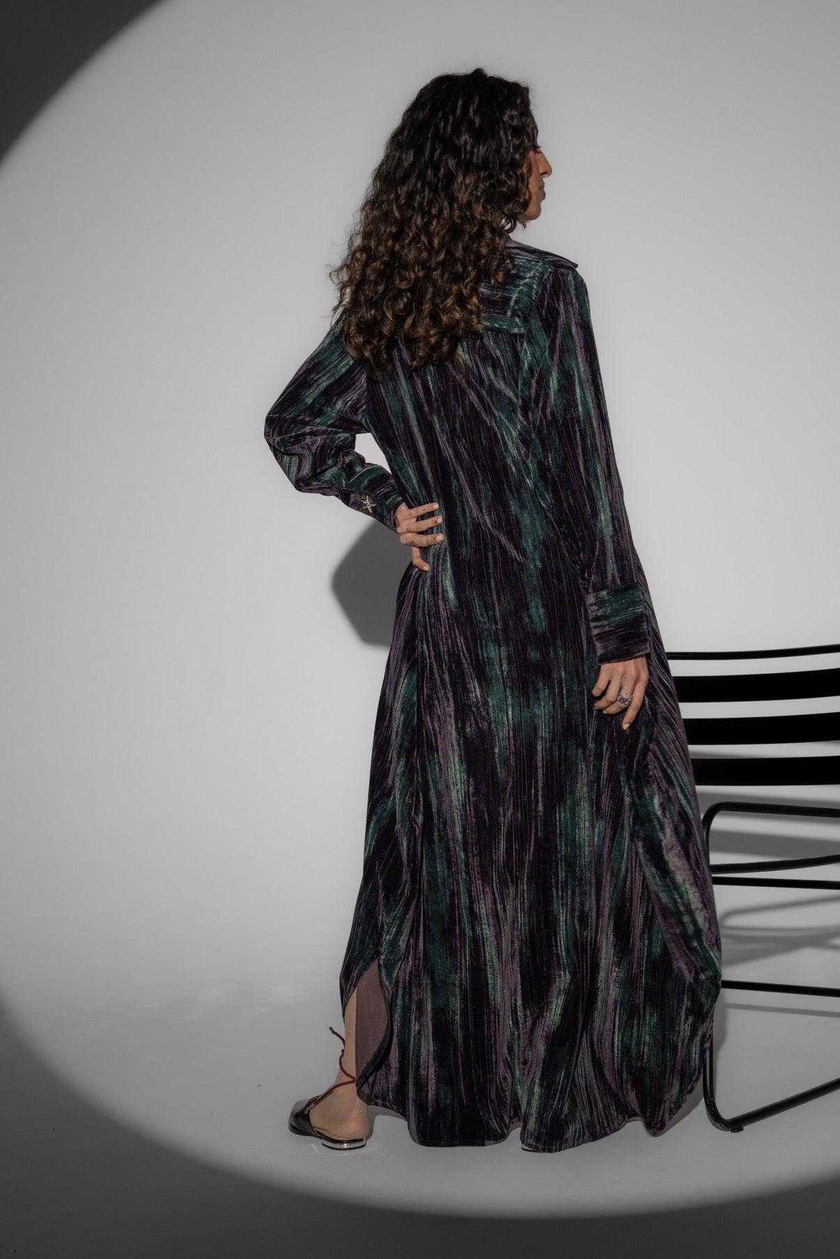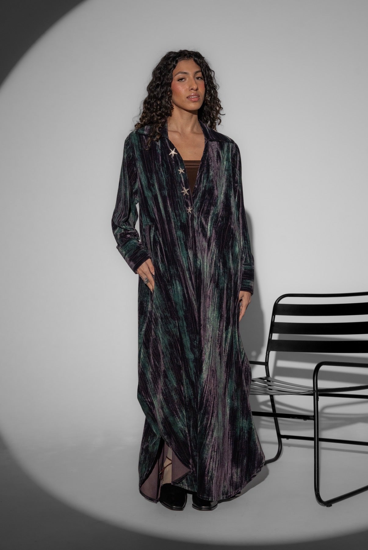 A multi color velvet dress with silver buttons