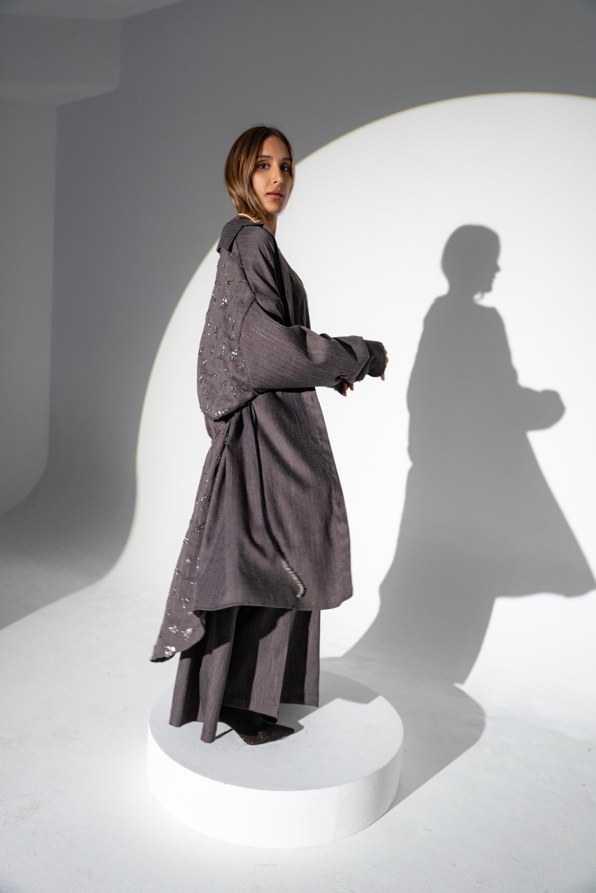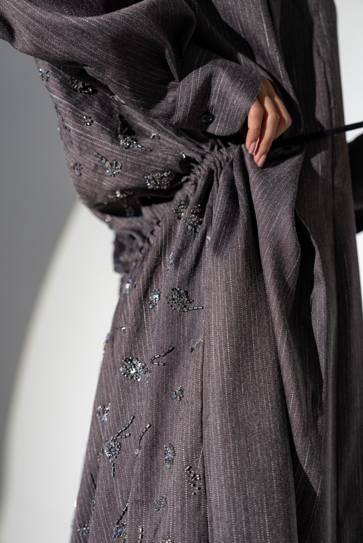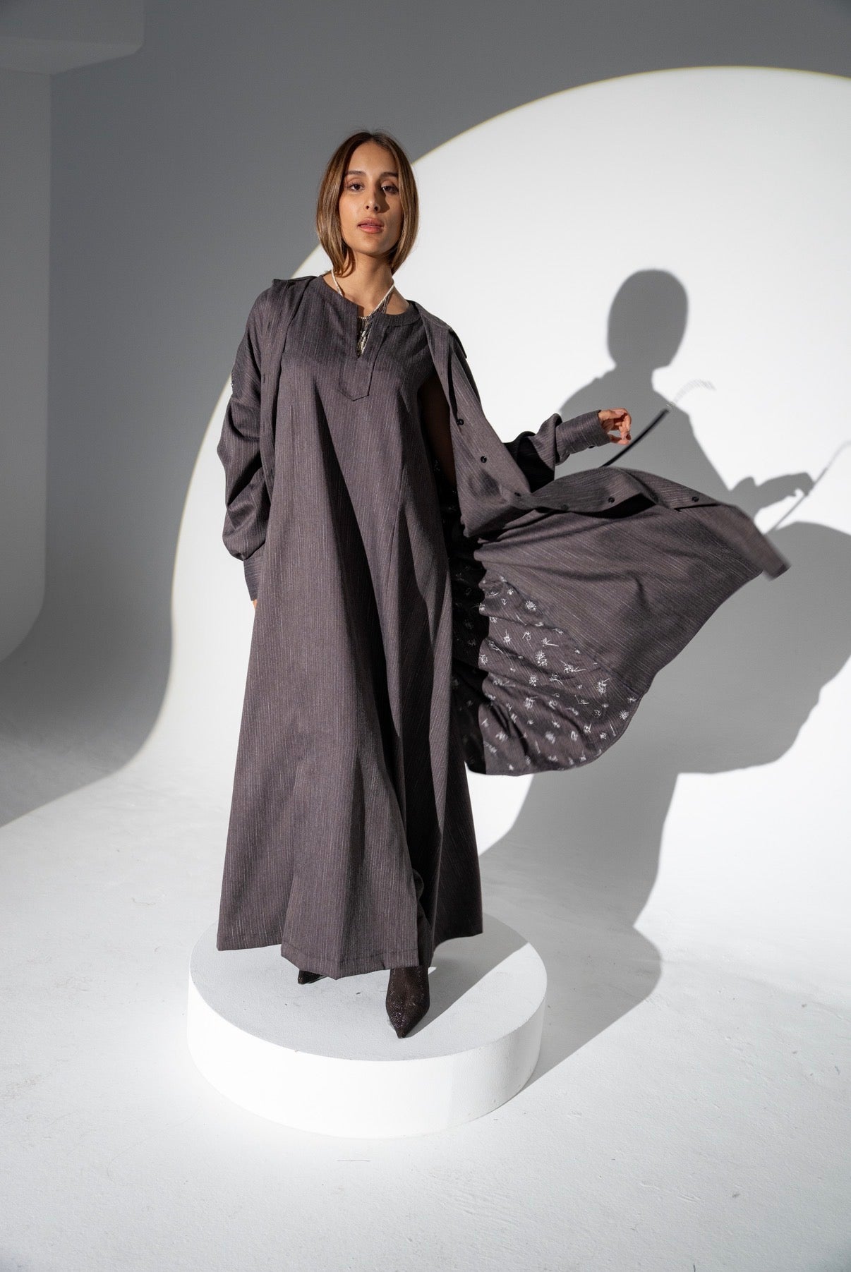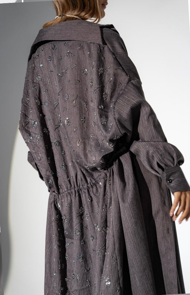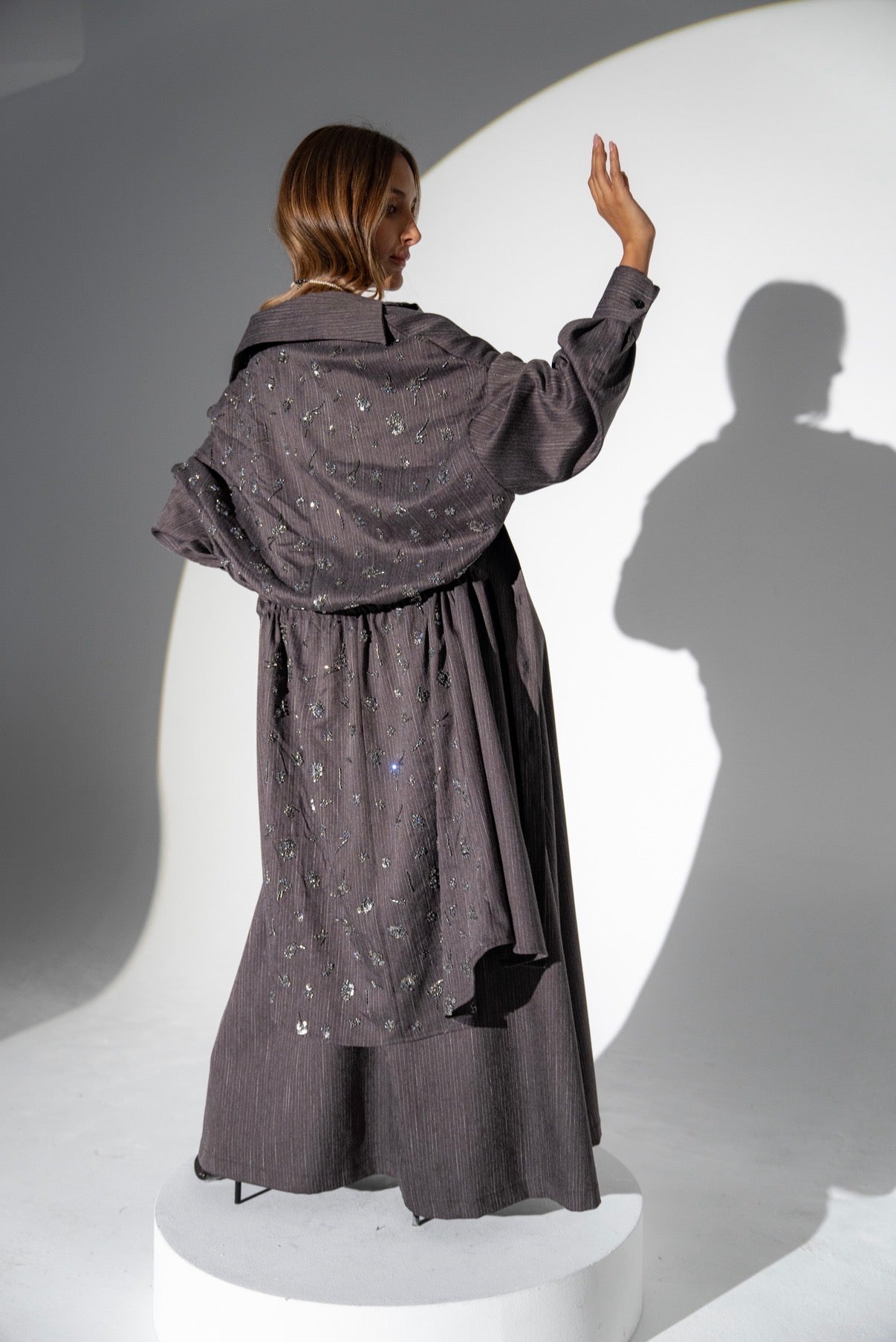 A two-piece set with a sleeveless linen and wool blend dress and a jacket with embellished back details.