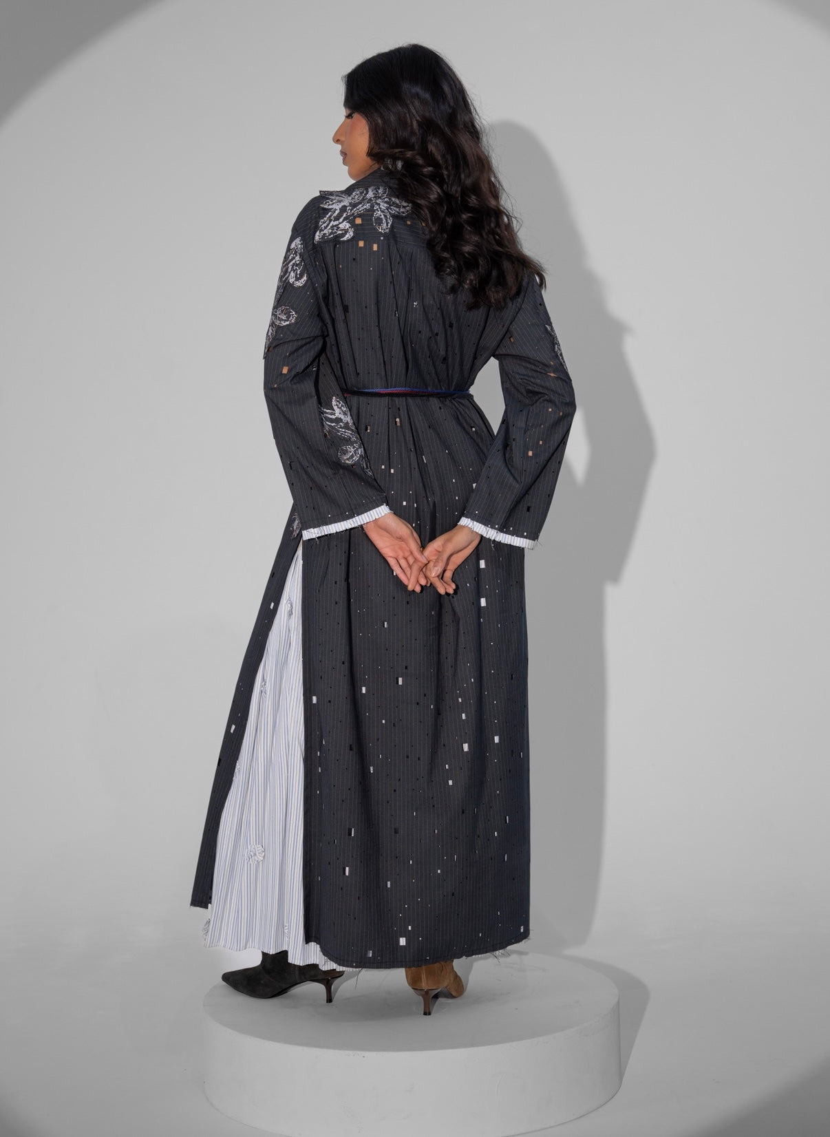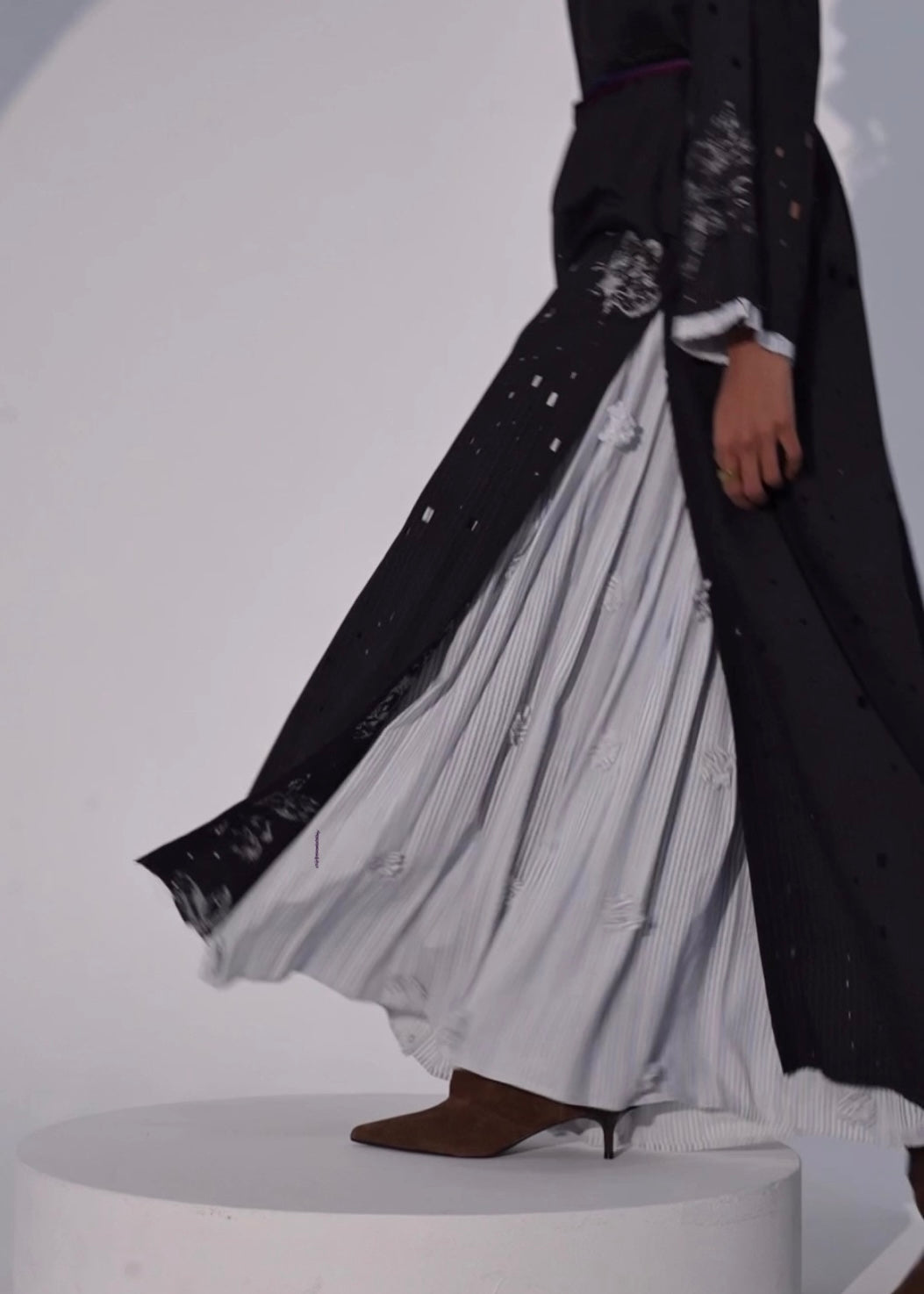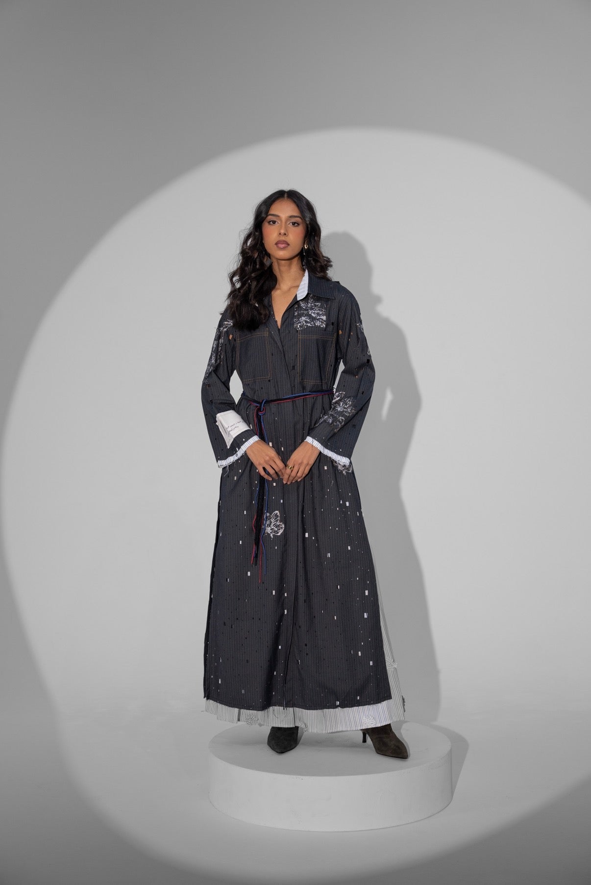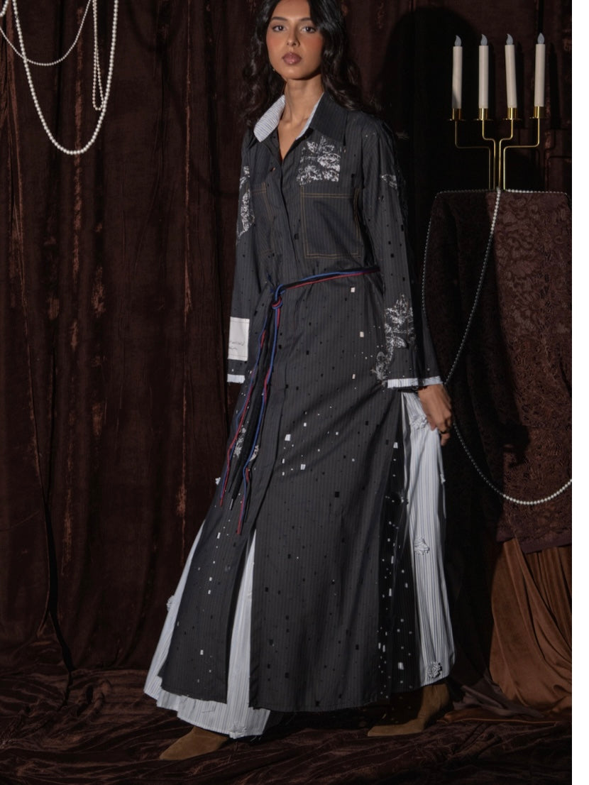 A long-sleeve dress with embroidered and embellished sleeve details, layered over a skirt and finished with a contrasting cuff and a trio belt.