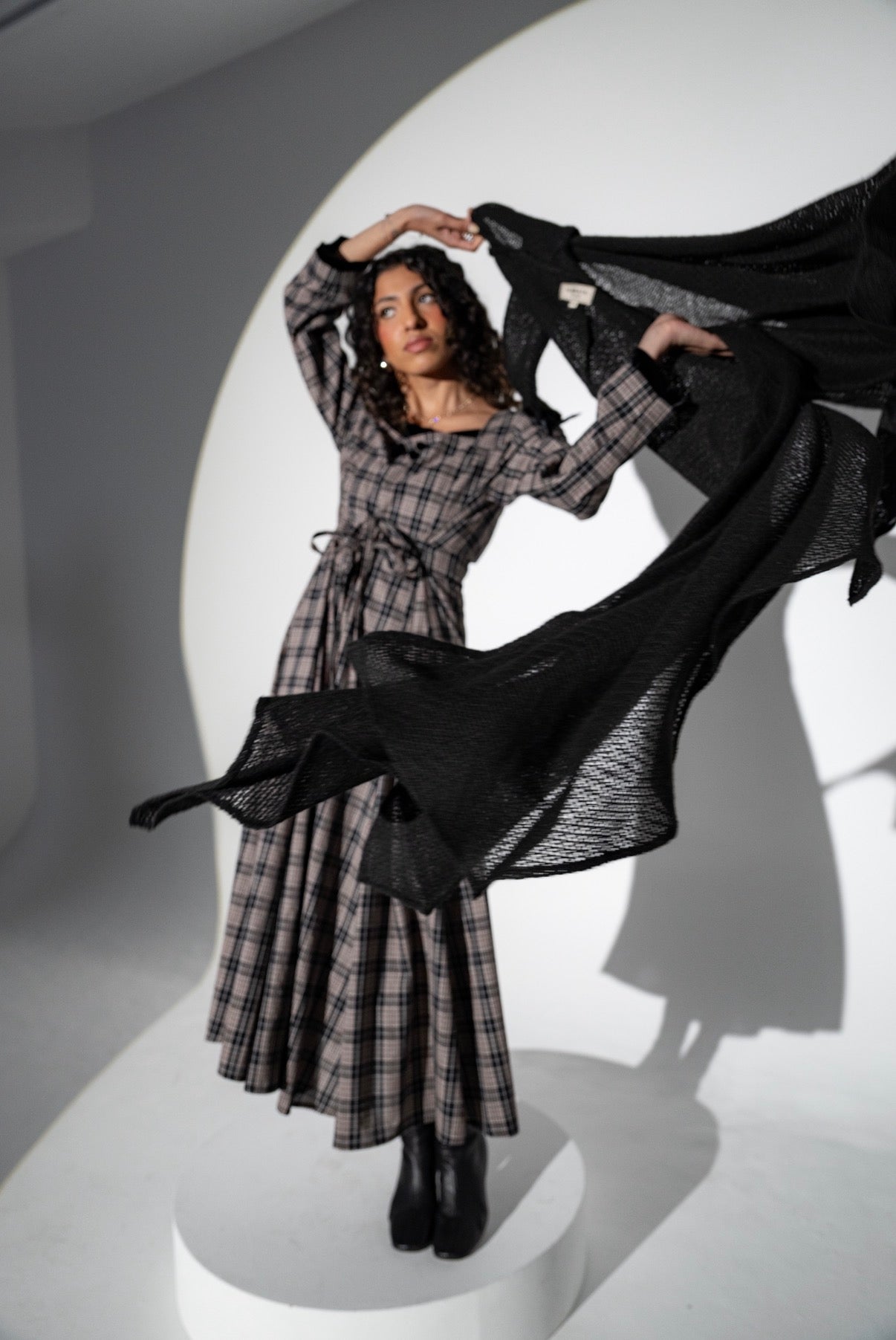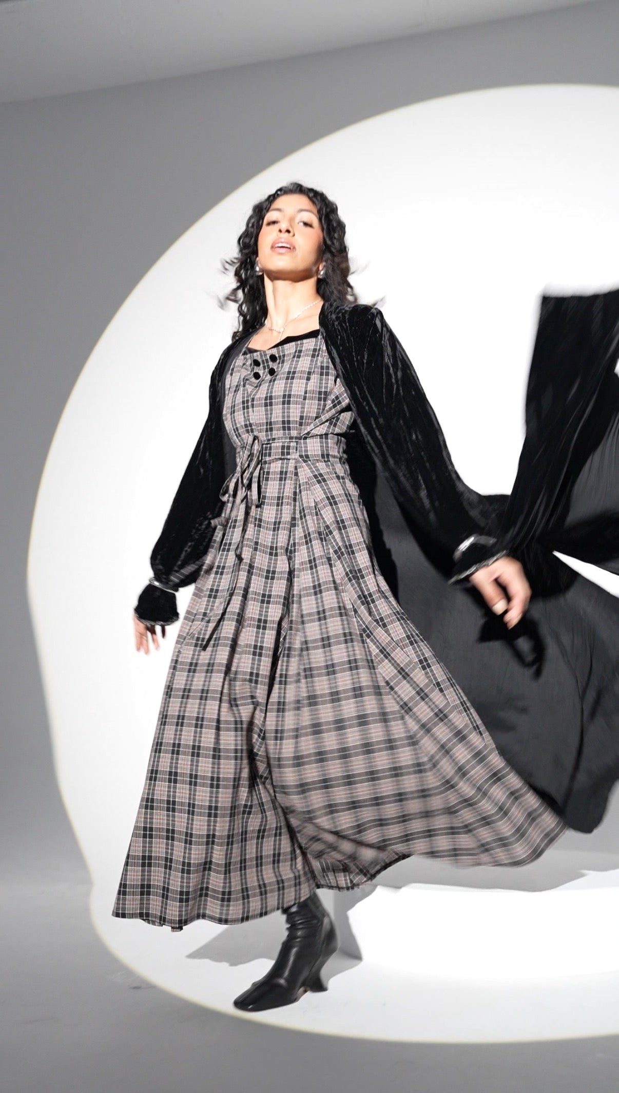 A long sleeve checked dress with velvet buttons details and collar trim.. with an asymmetrical black velvet bisht